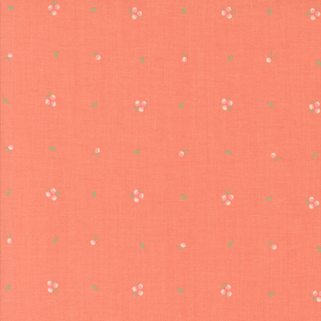 Scattered small floral and leaf print on a coral background. This fabric is designed by Corey Yoder for Moda. 100% cotton. 42" wide.