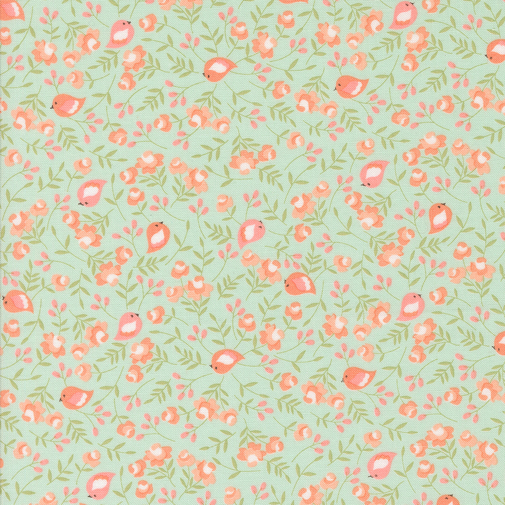 Sweet floral & bird print on a robins egg background. This fabric is designed by Corey Yoder for Moda. 100% cotton. 42" wide.