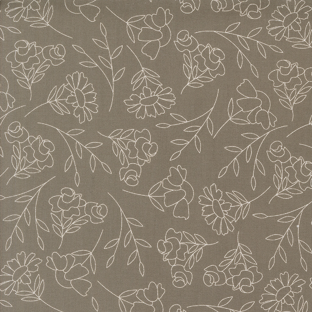 White floral outline print on a slate background. This fabric is designed by Corey Yoder for Moda. 100% cotton. 42" wide.