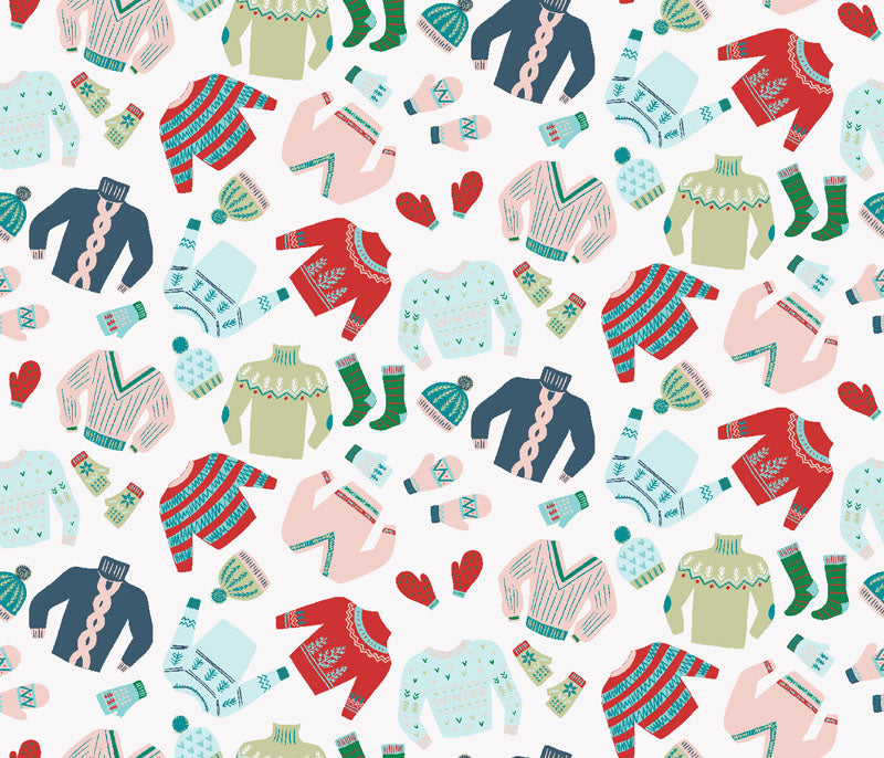 Fun toss of warm winter clothes on a white background. 42" wide. 100% cotton.