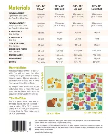Join the Capybara Club! These patchwork cuties are made using fat quarters and conventional piecing techniques. No templates or paper piecing! Pattern includes instructions for making a 36” x 45” Baby Quilt with two capybaras, a 58” x 66” Lap Quilt with 12 capybaras, or an 82” x 84” Large Quilt with 24 Capybaras. The pattern also includes instructions for making a 24” x 24” quilted pillow cover. The capybara blocks in all quilt sizes are made with fat quarters. The quilt also includes plant blocks, which are pieced with yardage of two different plant fabrics. Please refer to the pattern back for a complete materials list and yardages. Solid and/or small, non-directional fabrics are recommended. This is a patchwork quilt pattern. (No templates or paper piecing are used.) The projects in this pattern include some small pieces and are recommended for quilters familiar with rotary cutting and patchwork piecing.