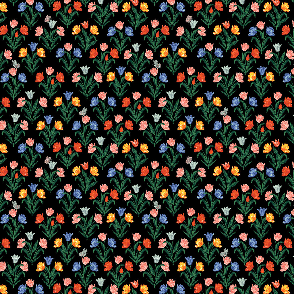 Colourful tulips on a black background.  Designed by Rifle Paper for Cotton + Steel.  100% cotton.  42" wide.