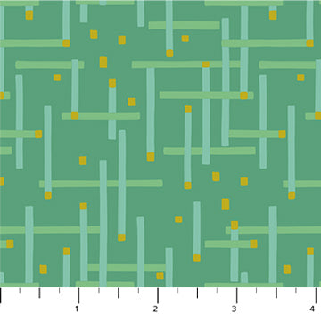 Modern print with a geometric desing and metallic gold dots a green background. From Figo, the modern division of Northcott. Northcott is a Canadian owned company. 42" wide. 100% cotton.