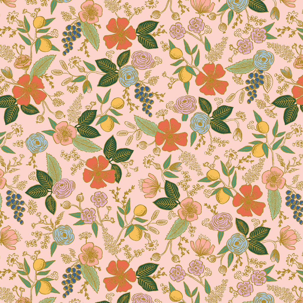 Colourful floral print on a blush background - accented with metallic gold.  Designed by Rifle Paper for Cotton + Steel.  100% cotton.  42" wide.