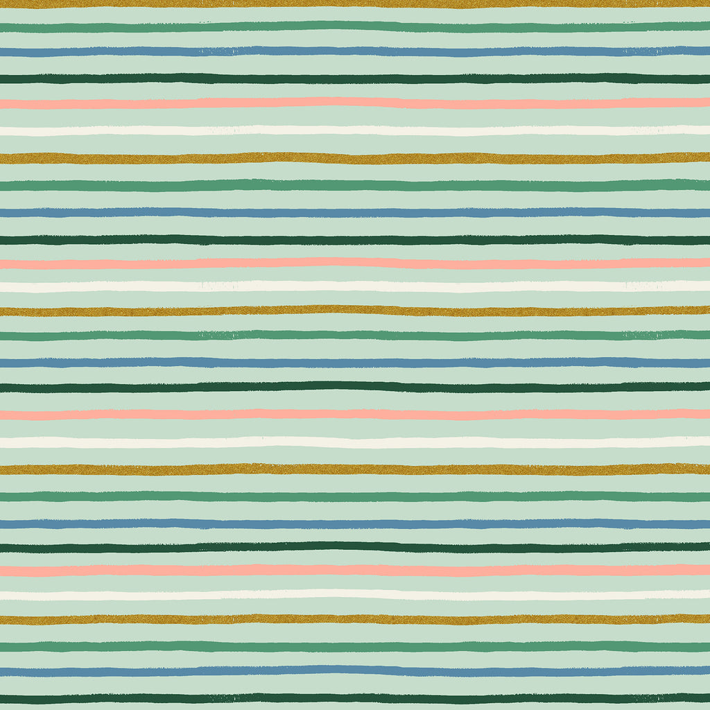 Fun striped print on a mint background.  One of the stripes in metallic gold.  Designed by Rifle Paper for Cotton + Steel.  100% cotton.  42" wide.