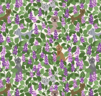 Fun little toss of cats frolicking in catnip.  100% cotton.  42" wide.