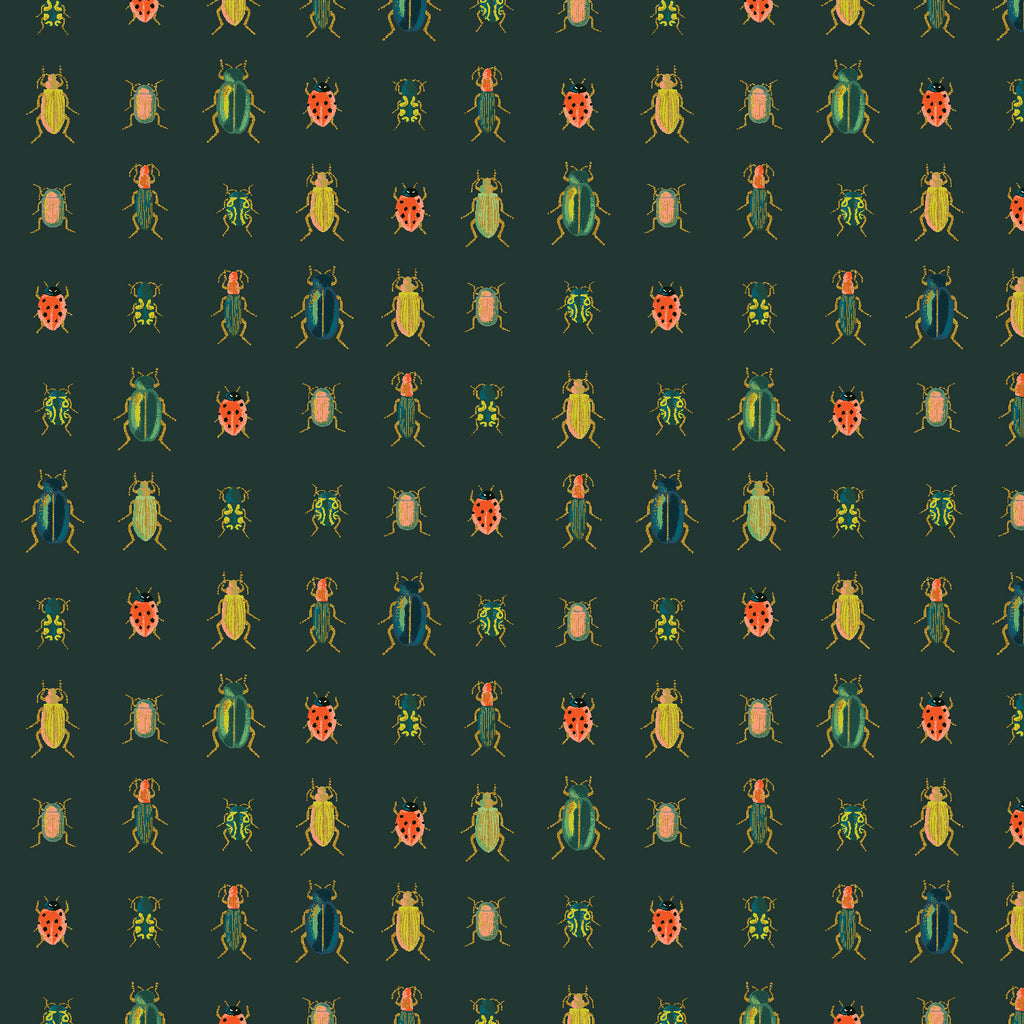 Small bug fabric accented with metallic gold on a dark green background. Designed by Rifle Paper for Cotton + Steel. 100% cotton. 42" wide.