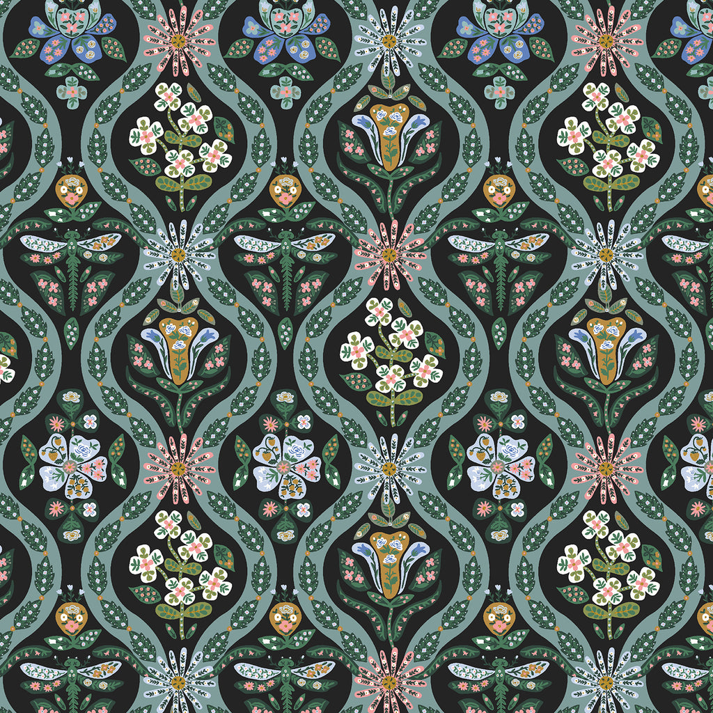 Elegant floral trellis motif on a black background, lightly accented with metallic gold. Designed by Rifle Paper for Cotton + Steel. 100% cotton. 42" wide.