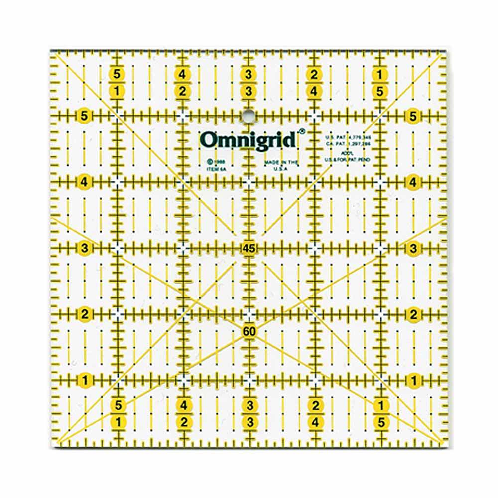 The Omnigrid 6in x 6in ruler is used for secondary cutting and cutting strips when quilting; it is also excellent for use as a foundation piecing tool, as a great template for 6in blocks, and for scrapbooking.