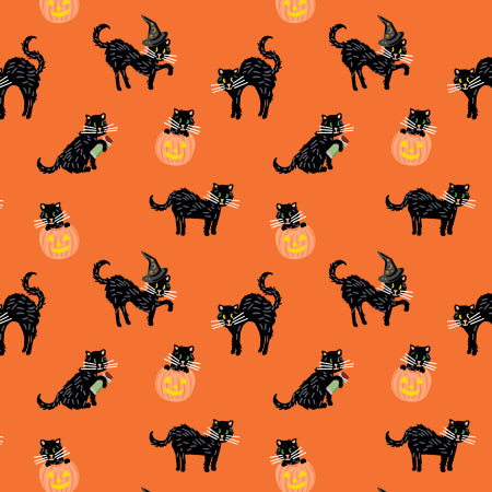 Black Halloween cats on a bright orange background.  Designed by Rifle Paper for Cotton + Steel.  42" wide. 100% cotton.