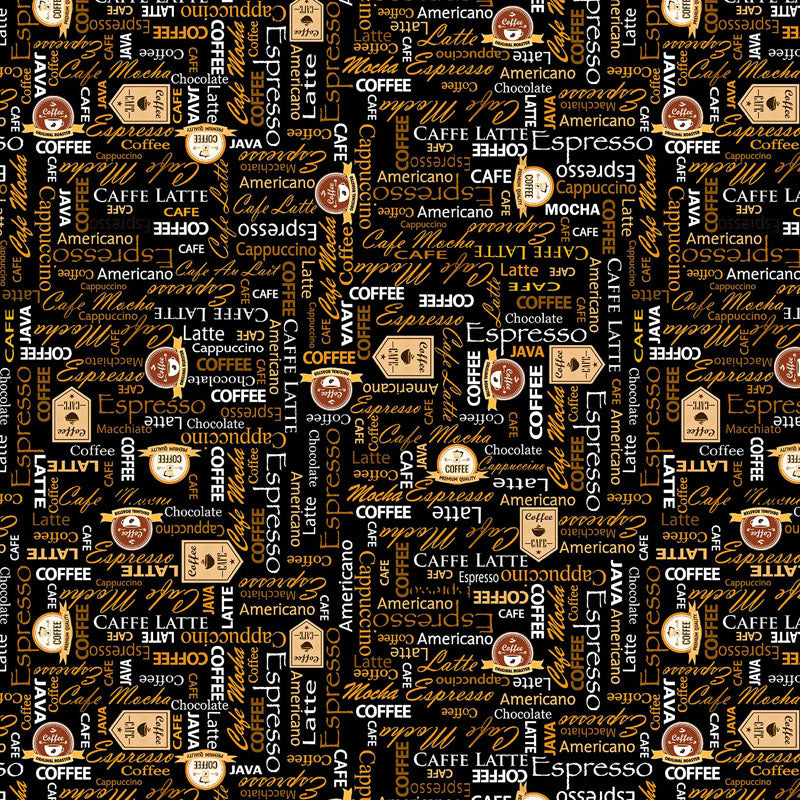 Coffee themed text on a black background. 42" wide. 100% cotton.