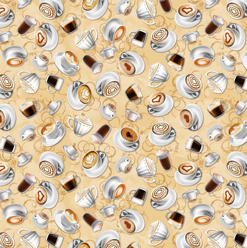 Cups of coffee on a light background. 42" wide. 100% cotton.