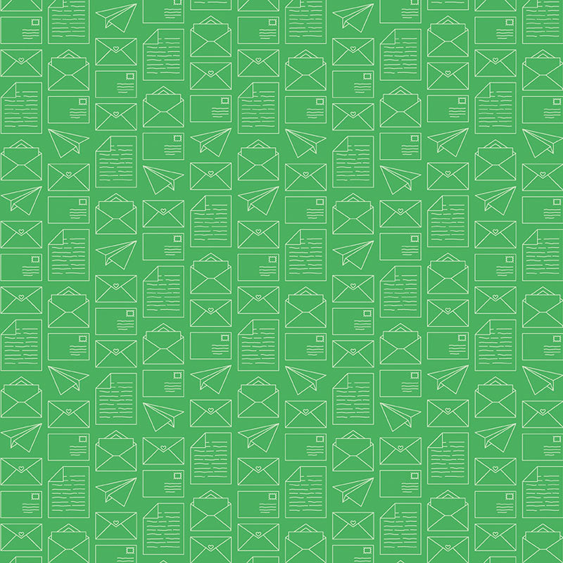 Letters in a tone on tone green colorway. 42" wide. 100% cotton.
