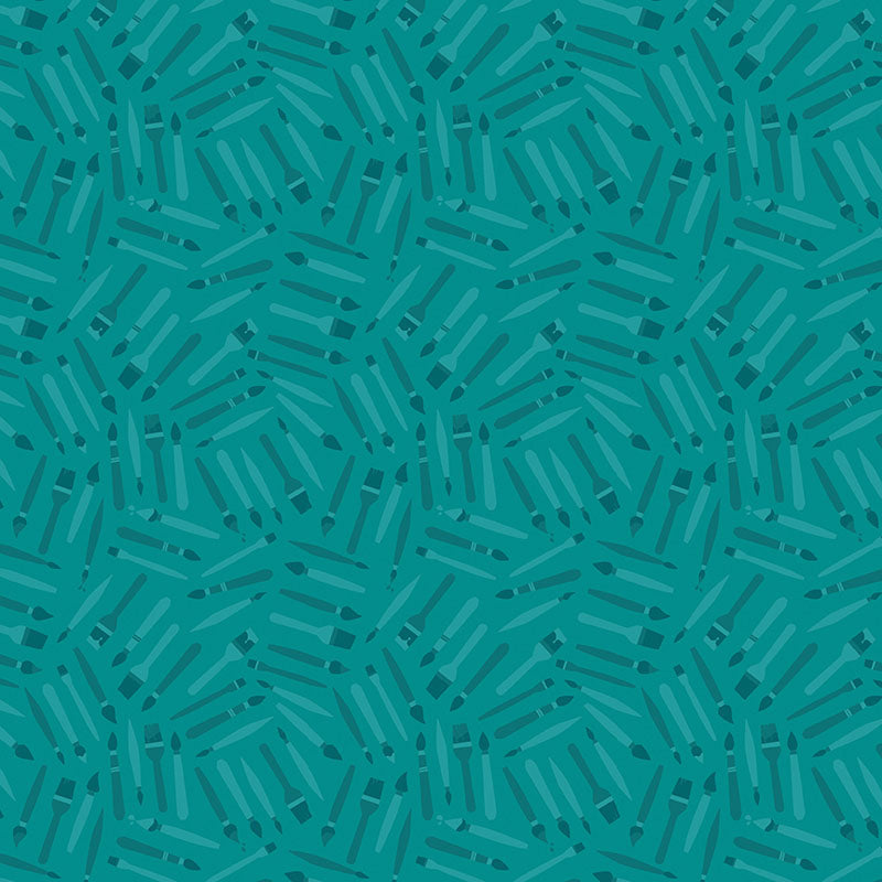 Tone on tone paintbrushes in a teal colourway. 42" wide. 100% cotton.