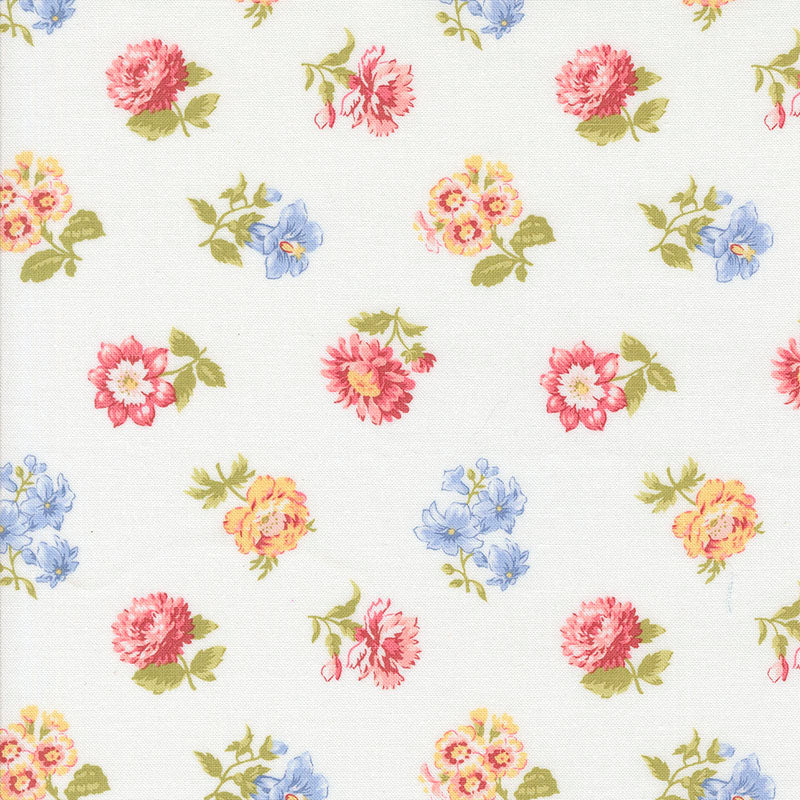 Traditional floral print on a white background.  Designed by Brenda Riddle for Moda.  42" wide. 100% cotton.