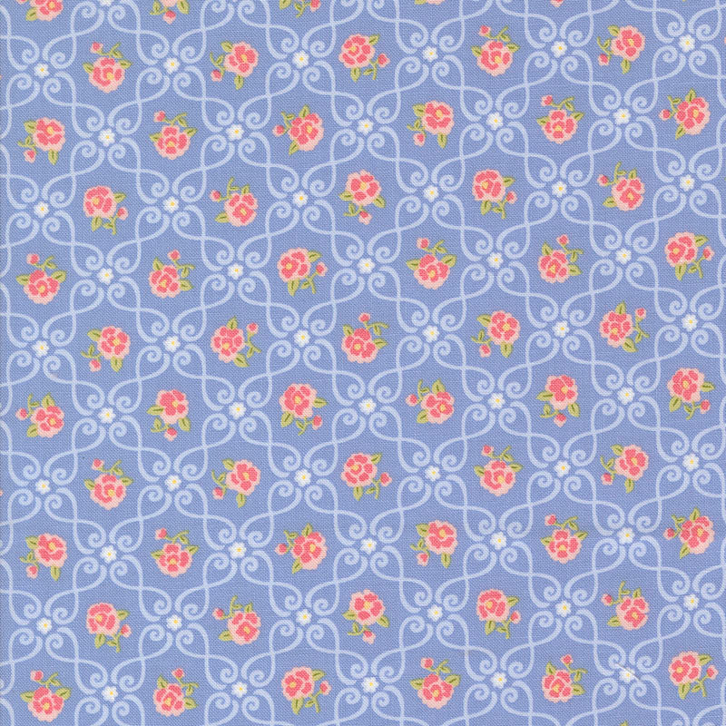 Traditional floral printon a blue background.  Designed by Brenda Riddle for Moda.  42" wide. 100% cotton.