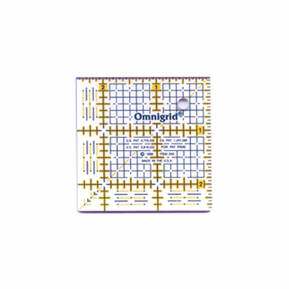 The Omnigrid 2.5in x 2.5in ruler with 1/16in markings is perfect template for miniatures and color wash quilts; it can also be used as a cutting template for squares and to check seam allowance accuracy; its petite size is ideal for hanging on a keychain or lanyard.