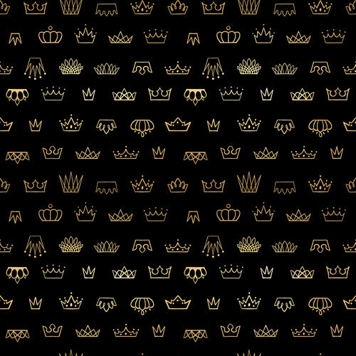 Small metallic gold crowns on a black background.  All the crowns are metallic gold and consistent in colour although the lighting in  the picture makes the reflection off the gold look like variation.  This fabric is part of the Reign collection by Rashida Coleman-Hale of Ruby Star Society for Moda. 100% cotton.  42" wide .