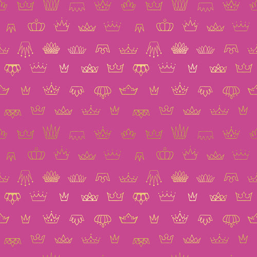 Small metallic gold crowns on a pink background.  All the crowns are metallic gold and consistent in colour although the lighting in  the picture makes the reflection off the gold look like variation.  This fabric is part of the Reign collection by Rashida Coleman-Hale of Ruby Star Society for Moda. 100% cotton.  42" wide .