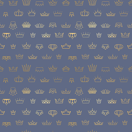 Small metallic gold crowns on a slate blue background. All the crowns are metallic gold and consistent in colour although the lighting in the picture makes the reflection off the gold look like variation. This fabric is part of the Reign collection by Rashida Coleman-Hale of Ruby Star Society for Moda. 100% cotton. 42" wide .