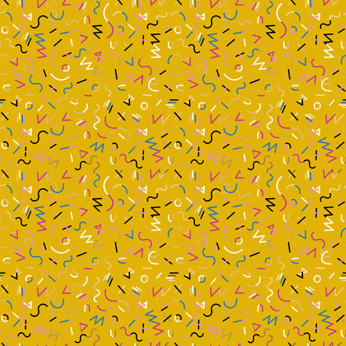 Fun doodly motifs on a dark yellow background. Some of the motifs are metallic gold. This fabric is part of the Reign collection by Rashida Coleman-Hale of Ruby Star Society for Moda. 100% cotton. 42" wide .